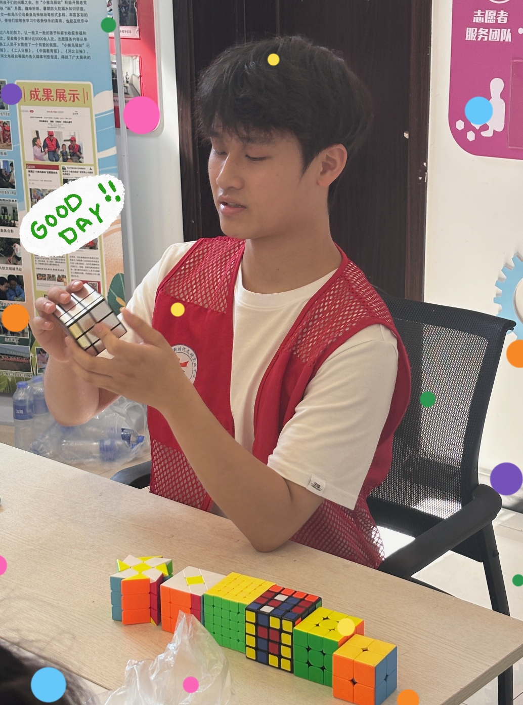 活动首日,实践团队的大学生辅导员们以“趣味魔方”课程拉开实践序幕。面对充满好奇的青少年,辅导员们从最基础的三阶魔方结构讲起,用生动的比喻将“棱块”“角块”比作“积木伙伴”,帮助孩子们理解魔方构造。课堂上,辅导员们手把手示范“十字还原法”,耐心纠正手势细节,还设计了“魔方接力赛”“最快还原挑战”等小游戏。从最初的手足无措到逐渐掌握技巧,孩子们的脸上渐渐洋溢起成就感。“原来魔方一点都不难!我现在能独立还原一面啦!”第二天课程结束后,社区青少年小林举着魔方兴奋地说。两天的魔方教学不仅锻炼了孩子们的空间思维能力,更在轻松的氛围中培养了专注力与耐心。