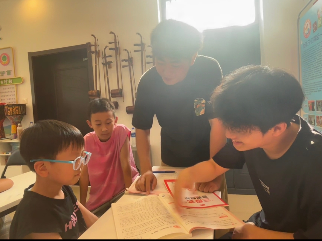 经过两天的趣味课程预热,实践团队于第三天、第四天转入“课后作业辅导”环节。针对不同年级学生的学业需求,辅导员们分组开展辅导,重点帮助孩子们梳理数学公式、讲解语文阅读技巧、巩固英语单词记忆。遇到复杂题目时,大学生们用“思维导图”“情景代入”等方法拆解难点,引导孩子们主动思考;对于基础薄弱的学生,更是一对一耐心讲解,鼓励他们大胆提问。“大哥哥教我用画图法解应用题,比课本上的方法更简单!”五年级学生小宇说。辅导过程中,辅导员们还注重培养孩子们的学习习惯,提醒他们整理错题、规划时间,让暑期学业复习更高效。