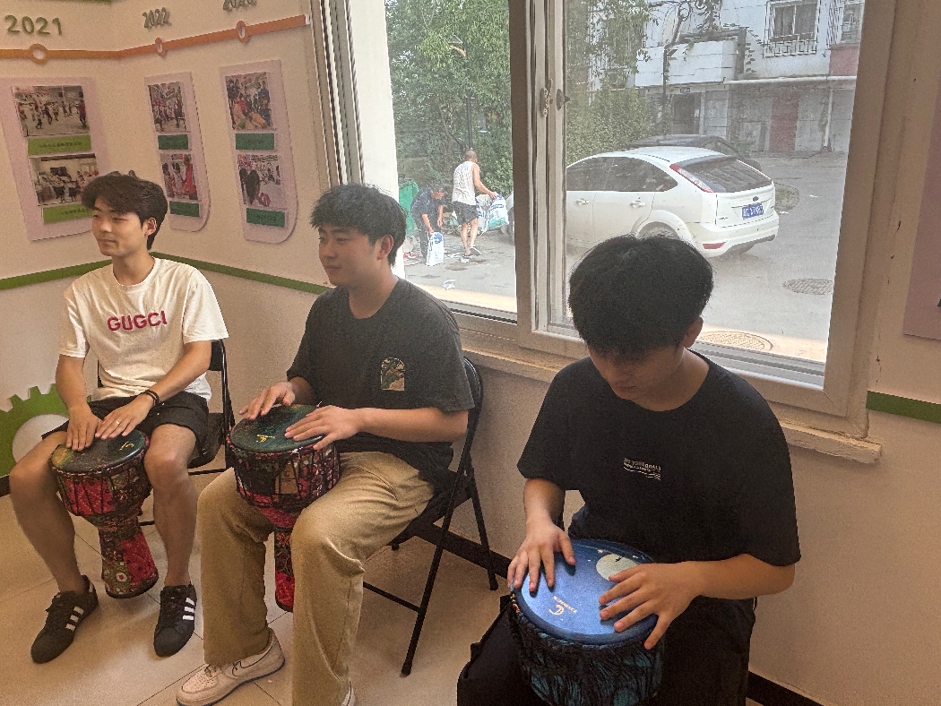 实践活动第五天,充满活力的“非洲鼓教学”成为收尾亮点。大学生辅导员们带着色彩鲜明的非洲鼓来到课堂,先通过一段热情的鼓乐表演点燃气氛,随后从鼓面分区、基本节奏型教起,用“咚——哒啦——”的口诀帮助孩子们掌握节拍。课堂上,孩子们跟着辅导员的示范拍打鼓面,从零散的节奏到整齐的合奏,欢声笑语与鼓点声交织成欢乐的乐章。“非洲鼓不用认谱也能玩,太有趣了!”孩子们在分组合奏中体验着协作的快乐,也感受着多元文化的魅力。