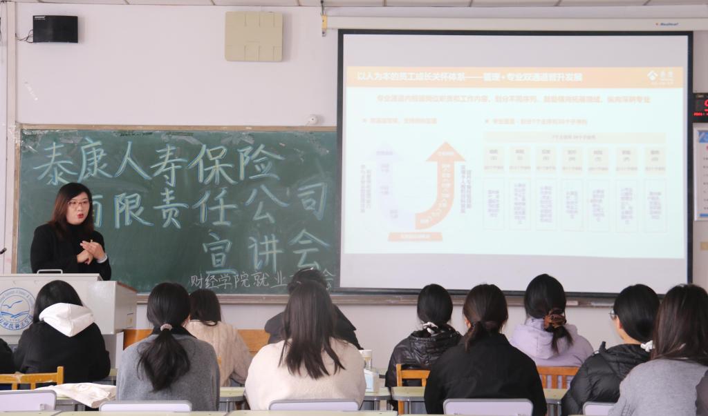 为帮助财经类学子精准对接优质就业资源,明晰大健康产业就业方向,2025年10月21日太阳集团2007网站特邀泰康保险集团子公司——泰康人寿保险有限责任公司在A509教室举办2026年校园招聘专场宣讲会。本次宣讲会以“长寿时代 共筑未来”为主题,吸引众多学生参与。